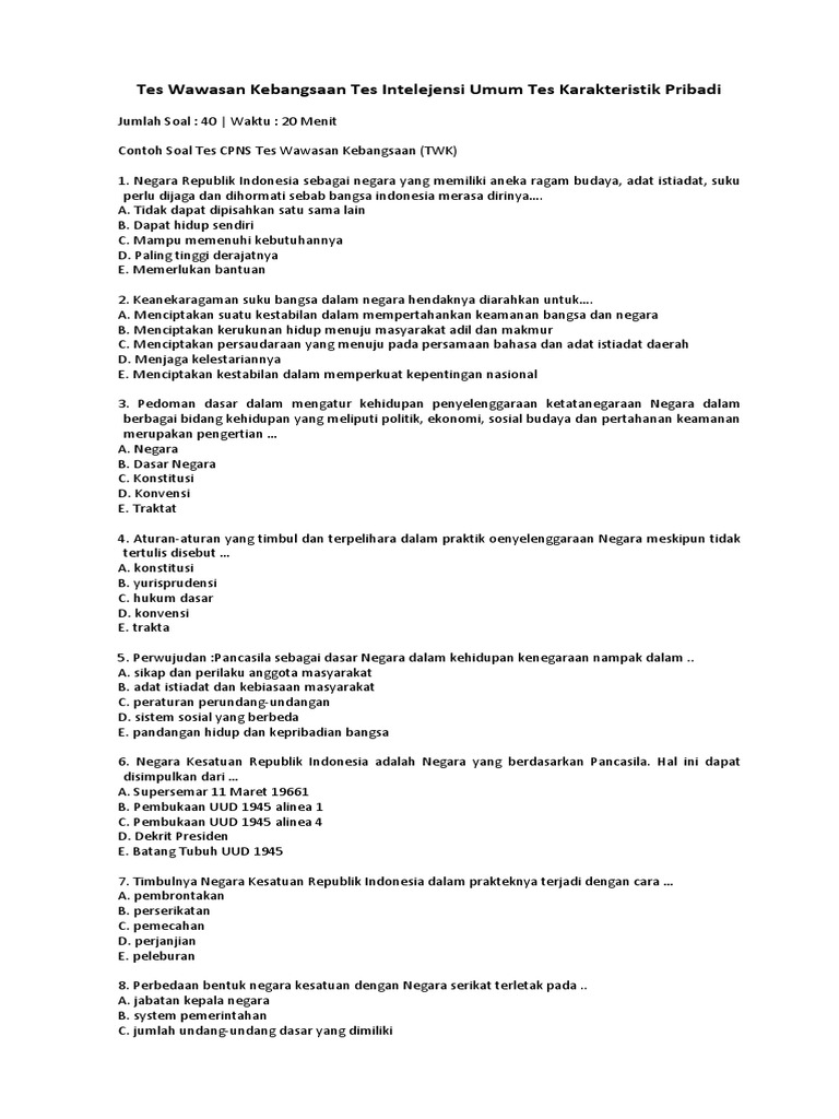 Negara adalah alat masyarakat untuk mengatur hubungan antara manusia dalam masyarakat tersebut. Banyak peserta tes yang gagal pada tes wawasan kebangsaan ini karena pada saat masa kuliah pengetahuan tentang wawasan kebangsaan ini. Pernyataan ini merupakan pengertian negara ditinjau dari segi negara sebagai: Kontribusi anda dalam berkomentar dan berbagi sangat bermanfaat bagi kemajuan web ini dan pengunjung. Jul 31, 2021 · download soal tes wawasan kebangsaan dan kunci jawaban pdf untuk memperkaya pengetahuan dan pemahaman anda tentang materi tes wawasan kebangsaan sehingga mampu bersaing dalam tes seleksi kompetensi dasar cpns, silahkan unduh latihan soal twk skd cpns berikut.